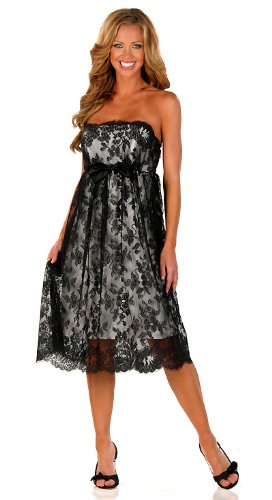 Breathtaking black lace masterpiece is both stunning and flirty. Black lace is beautifully contrasted with silver lining for an ethereal effect. Strapless bodice with empire waist features a charming bow at the front. Hidden back zipper. Color: Black. Fabric Contents: Nylon/Poyester/Acetate. Made in the USA.